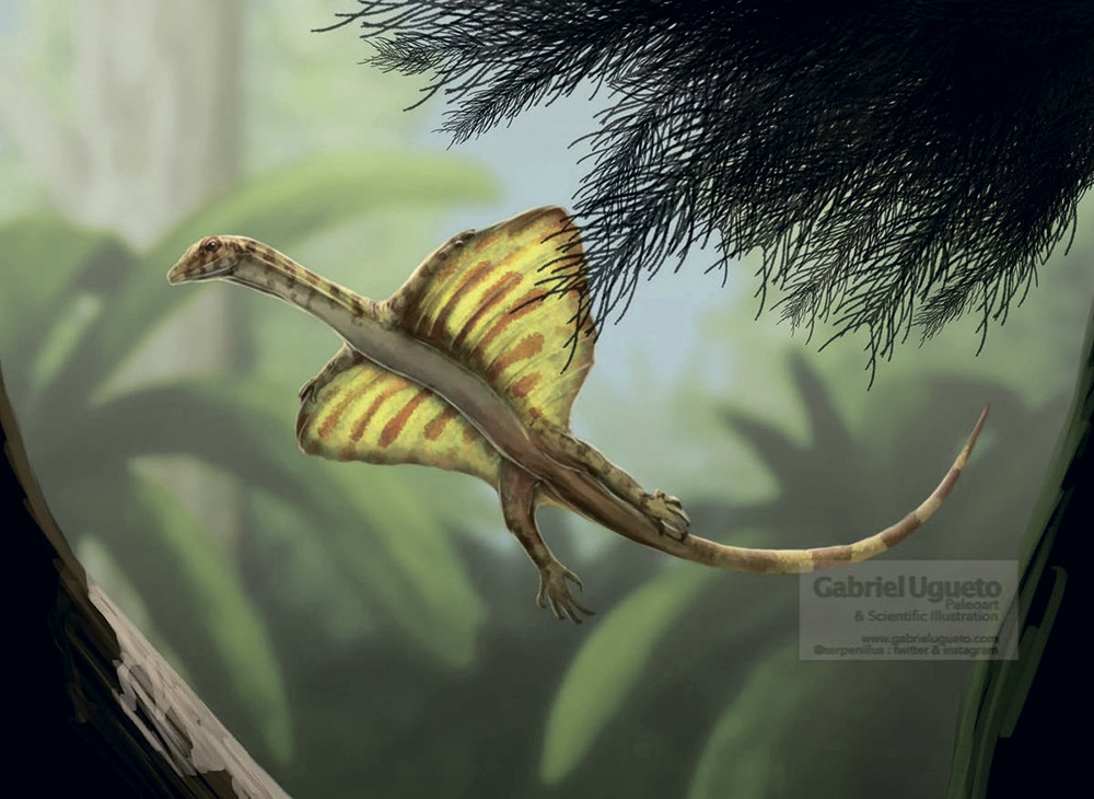 В процессе эволюции архозавроморфы тоже обратили свой взор к воздуху, причем происходило это несколько раз. Так, в позднем триасе в Вирджинии (~220 млн лет) жила рептилия мекистотрахелос (Mecistotrachelos apeoros Fraseretal., 2007), у которой мы встречаем знакомую структуру: удлиненные ребра, между которыми должна была проходить перепонка. Правда, эксперимент оказался неудачным, и никаких других подобных архозавроморфов мы не нашли. Куда более успешным был киргизский шаровиптерикс (Sharovipteryx mirabilis (Sharov, 1971)), обитавший примерно в то же время, что и мекистотрахелос. Он додумался сделать крылья, правда, ненормальные: перепонка у шаровиптерикса располагалась на задних конечностях, из-за чего он вряд ли был способен к активному полету, ограничиваясь лишь планированием. Эта конструкция оказалась более успешной, чем глайдермекистотрахелоса, поскольку известно целых два рода, пошедших по этому извращению с ногами: кроме шаровиптерикса, подобную структуру нашли у озимека (Ozimek volans Dzik&Sulej, 2016), жившего несколько раньше, 230 млн лет назад, на территории современной Польши. Озимек считается родственником киргизского «парашютиста», составляя обособленную летающую кладу внутри семейства танистрофеид (Tanystropheidae Gervais, 1858), которые были этакими «вездеходами» триаса. Среди них встречались и плавающие, и наземные формы, но о них стоит поговорить отдельно.