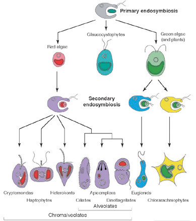 Все водоросли – это организмы, способные к фотосинтезу в большей или меньшей степени. Первыми такими организмами были сине-зеленые водоросли (Cyanobacteria Stanier, 1973), которые вообще являются бактериями. Позднее именно эти организмы вступят в симбиоз с одними из ранних одноклеточных эукариотов, дав тем самым начало предкам растений. Однако когда произойдет разделение ветвей красных и зеленых водорослей, уже они начнут вступать в симбиоз с другими одноклеточными, создав так называемые вторичные хлоропласты. В основном участвовали красные водоросли, зеленые дали начало хлоропластам лишь у двух групп. Давайте посмотрим на эти группы.