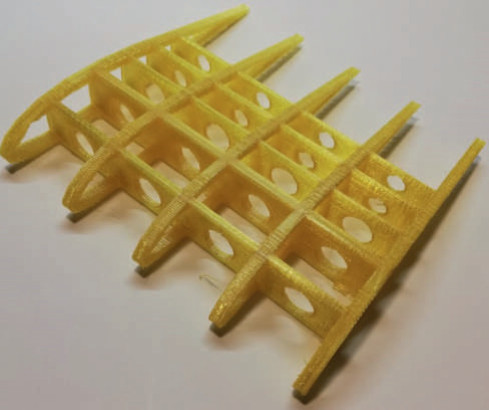 Также этот метод производства позволяет сделать сложную внутреннюю конструкцию для охлаждения камеры сгорания и сопла, что иногда без применения технологии 3D-печати невозможно или практически невозможно. В процессе гибки или сварки могут образовываться дефекты конструкции в местах изгибов или соединения элементов конструкции. В качестве примера был напечатан элемент конструкции крыла на 3D-принтере из пластика (рис. 2).