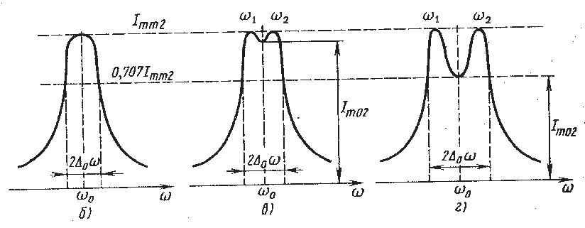 Из теории известно, что при коэффициенте связи контуров К > 0,7 их резонансная кривая приобретает «двугорбый» вид с резонансами на частотах Ꞷ1 и Ꞷ2, показанный на рис. 2. Чем больше коэффициент связи контуров К, тем больше отличаются резонансные частоты Ꞷ1 и Ꞷ2, которые определяются по следующим формулам.