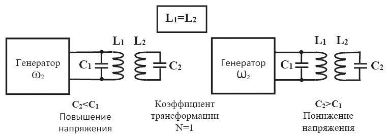 Следовательно, чтобы повысить или понизить напряжение, достаточно изменять соотношение емкостей конденсаторов в контурах без изменения числа витков в контурах. Никакой дополнительный повышающий или понижающий трансформатор не потребуется.