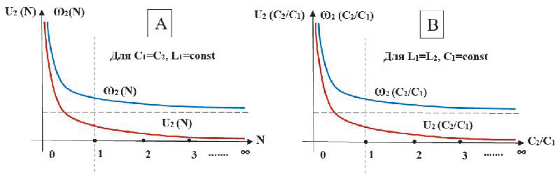 В то же время резонансы будут наблюдаться даже тогда, когда параметры первого и второго контура не совпадают. Правда, на других частотах – Ꞷ1 и Ꞷ2, но все равно будут наблюдаться. И вот здесь происходит самое интересное с точки зрения преобразования напряжения. Напряжение на выходном контуре будет зависеть от соотношения резонансных частот контуров, на которые они первоначально настроены. Чем выше резонансная частота выходного контура по отношению к входному контуру, тем выше напряжение на выходе. И наоборот. Обобщенные графики этой зависимости представлены на рис. 3 для случаев (А) и (В).