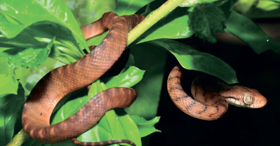 Речь идет о змее под названием коричневая бойга (Boiga irregularis Merrem, 1802). В естественной среде она встречается на северо-западе Австралии, в Новой Гвинее и на ряде близлежащих островов. Хоть змея и ядовита, для человека опасности не представляет, чего нельзя сказать о птицах и мелких млекопитающих, составляющих ее рацион.