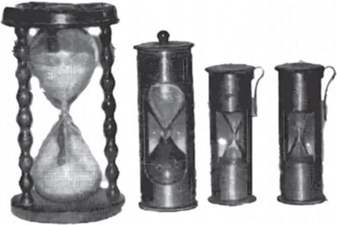 Естественно, что точность наблюдения за временем, как и у нынешних часов, подвергалась проверке. Но если мы свои часы в настоящее время можем проверить с помощью сигналов точного времени по радио, то точность отсчета склянок проверялась по наблюдениям небесных светил, по ним поверяли и песочные, и механические часы. Однако это была сложная процедура: если широта легко вычислялась значением высоты Солнца в полдень, то для определения долготы требовалось тщательно выверять положение Солнца, Луны, планет или 57 звезд, видимых в любой час ночи. Сами склянки проверялась так: брали полуминутную склянку и время пересыпания песка из одной ее половины в другую контролировали по грузику на нитке. Длина нитки составляла 39,2 дюйма, или 99,6 см. За 30 сек. грузик, подвешенный на этой нитке, совершал ровно 30 колебаний. Можете проверить сами, если у вас есть секундомер. Выверенную таким образом склянку (как и сверенные по сигналам точного времени часы в таких случаях) используют для проверки остальных всех склянок – часовых, получасовых и так далее.
