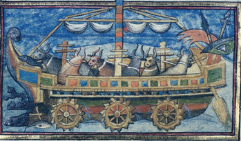 Первое упоминание в Европе о гребных колесах как средстве передвижения судов происходит из изданного в XV веке военного трактата IV или V веков «О военных делах»: «Военный корабль, пригодный для морских сражений, который из-за своих огромных размеров и человеческой слабости как бы не мог управляться руками людей. В его корпусе, или полой внутренности, волы, впряженные попарно в шпили, вращают колеса, прикрепленные к бортам судна; весла, выступающие над окружностью или изогнутой поверхностью колес, бьют воду своими ударами, как лопасти весел, когда колеса вращаются, работают с удивительным и изобретательным эффектом, их действие приводит к быстрому движению. Этот военный корабль, более того, из-за своей собственной массы и из-за механизмов, работающих внутри него, вступает в бой с такой сокрушительной силой, что он легко разрушает и уничтожает все вражеские военные корабли, приближающиеся на близкое расстояние». Документ, будучи адресованным римскому императору в виде докладной записки, был «положен под сукно» чиновниками, где и пролежал в полной безвестности вплоть до первого издания более чем 1000 лет спустя.
