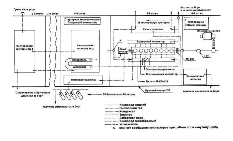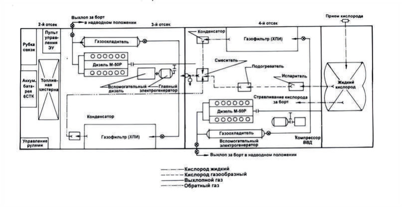 Отбор избытка отработанных газов осуществлялся приводившимся от главного двигателя компрессором с максимальным давлением нагнетания 225 кг/см², служившим также для пополнения запаса воздуха высокого давления. Для исключения появления пузырькового следа от выхлопных газов на поверхности воды предусматривалось сжижать содержащийся в них углекислый газ под давлением 60–110 кг/см² и хранить его в 78 баллонах емкостью по 68 л. Периодически углекислота из баллонов сбрасывалась за борт.