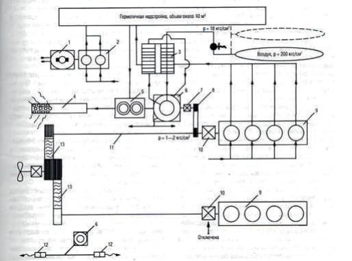 1 – динамо-машина; 2– бензиновый мотор – привод динамо-машины; 3– двухступенчатый подогреватель; 4 – подкильная труба для откачки за борт отработанных газов; 5 – газовый насос; 6 – воздушный двигатель; 7 – муфта воздшного двигателя; 8 – промежуточный вал с передачей; 9 – главный бензиновый мотор; 10 – муфта бензинового мотора; 11 – промежуточный вал; 12 – глушитель; 13 – цепная передача на гребной вал