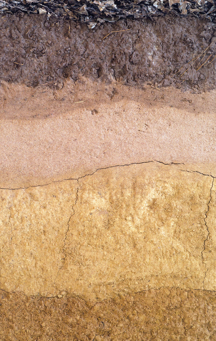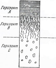 Верхний слой обычно содержит больше органического вещества и темнее окрашен, чем нижележащие слои. Он называется горизонтом А(А1), и в нем, как правило, находится максимальное количество гумуса. Это совокупность органических веществ, растительных и животных остатков разной степени разложения кроме тех, которые еще не утратили тканевого строения. Количество гумуса в почвенных горизонтах оценивается в процентах. Средняя часть почвенного профиля – горизонт В – содержит больше мелких частиц породы (ила, глины) и светлее окрашена. Далее идет так называемая материнская порода – горизонт С, из которой, собственно, и образуется почва. Часто горизонты постепенно переходят один в другой, а внутри них можно различить отдельные слои. Тогда выделяют переходные горизонты – АВ; В1; В2; В3; ВС.