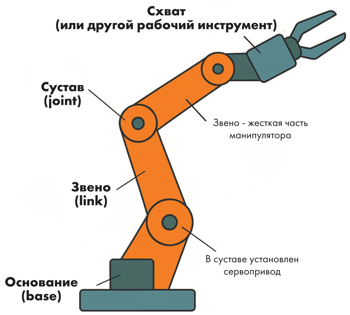 Звено – это «кость» робота, то есть жесткий элемент между двумя подвижными соединениями. Аналогия: плечо или предплечье.