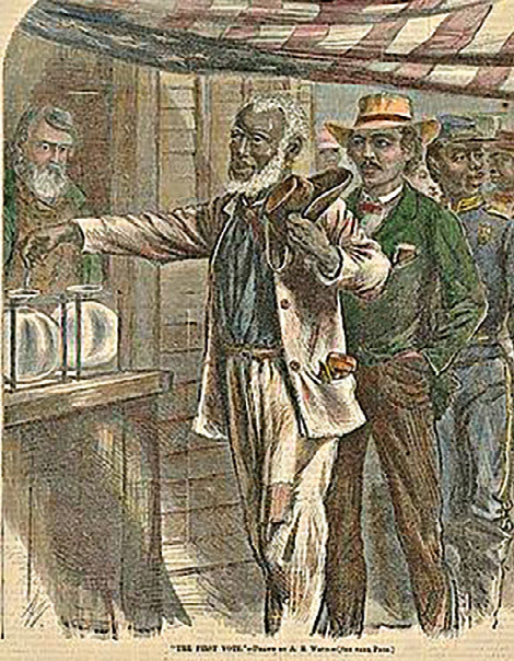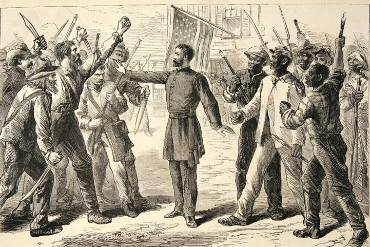 Бывших рабов насчитывалось примерно четыре миллиона, и их статус оказался крайне неопределенным. XIII поправка к конституции (запрещавшая рабство), вступившая в силу в декабре 1865 года, носила декларативный характер. По идее, техническими деталями должно было заняться Федеральное бюро по делам освобожденных рабов, закон о котором был принят в феврале 1866-го. В марте того же года Конгресс проголосовал за закон о гражданских правах, в котором декларировалось, что бывшие рабы признаются американскими гражданами с правами заключать договоры, владеть землей и обращаться в суд. На это решение было незамедлительно наложено президентское вето. Вето было преодолено конгрессменами, кстати сказать, впервые в истории США. Но затем закон встретил сильнейшее сопротивление на местах.