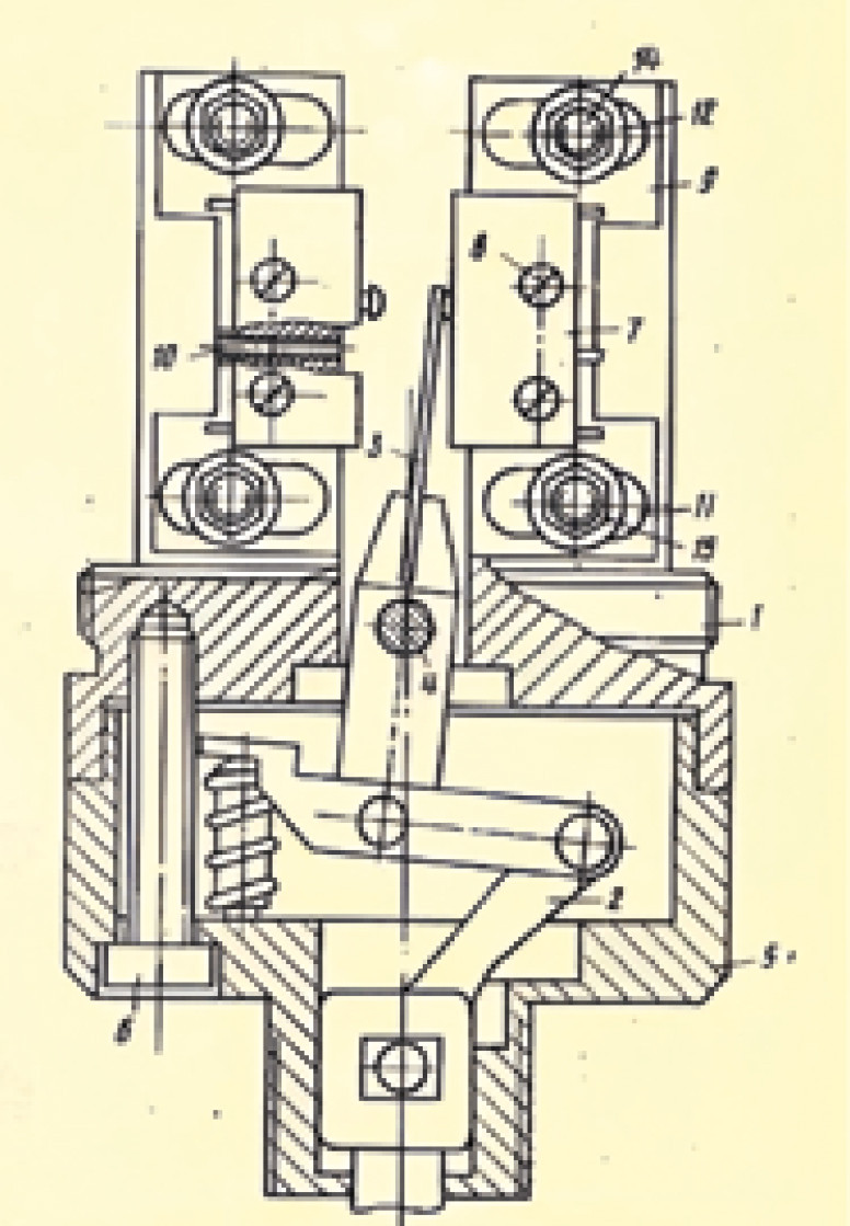 Очевидно, что для получения объективной информации об истинном состоянии контролируемого механизма, необходимо тем или иным способом связать шток сигнализатора с подвижным элементом механизма. При этом сначала необходимо привести в соответствие значения хода штока (согласно ТЗ, это 2–2,5 мм) со значением перемещения воздействующей непосредственно на кнопку микропереключателя (МП) детали, необходимого для переключения контактов последнего (порядка 0,5 мм). Подобное несовпадение этих значений исключает возможность прямого воздействия на кнопки МП штоком. Для приведения их в соответствие в конструкции сигнализатора используется рычажный (рис. 1) либо клиновой (рис. 2) механизм. При этом направление вектора воздействующего на кнопки МП усилия становится перпендикулярным по отношению к оси штока, а соотношение плеч рычажного механизма или угол наклона клиновой поверхности обеспечивают такое передаточное отношение, что рабочему ходу штока сигнализатора соответствует необходимое для переключения МП перемещение его кнопки.