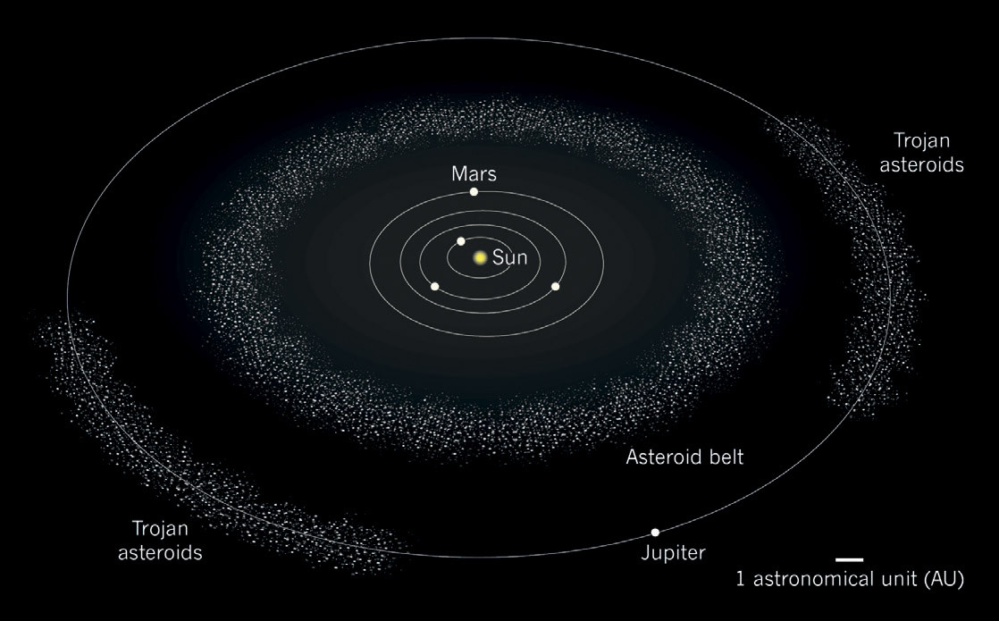 Как следствие, на схеме Солнечной системы можно видеть, что популяция астероидов уже мигрировавших на орбиту Юпитера очень велика. Для начала «трофеи» гиганта становятся «троянскими спутниками». И таких спутников у Юпитера уже не десятки, а тысячи.