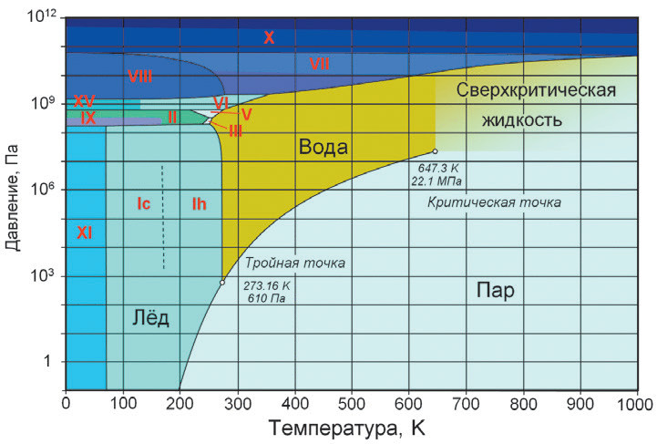 ...Можно заметить, что в перечне был пропущен лед IV, но речь не о всех фазах водяного льда, которых насчитывается 19, а лишь о встречающихся в составе небесных тел. По этой причине следующей за льдом VII и последней формой оказывается лед X, образующийся при давлении 70 Гигапаскалей (что соответствует условиям нижней мантии на глубине 300 км на Земле) и имеющий плотность 2,51 г/см3.