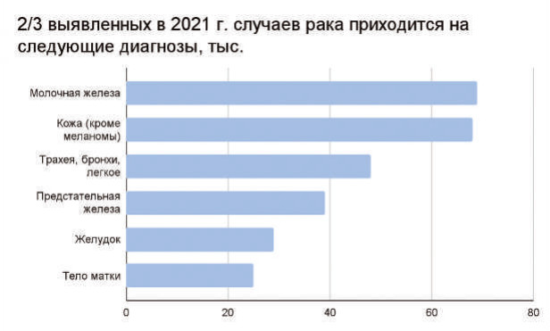 Онкологические заболевания остаются второй по значимости причиной смерти во всем мире. Так, согласно данным Всемирной организации здравоохранения (ВОЗ), только в 2020 г. в мире на долю рака приходилось около 10 млн смертей. В России, согласно данным Государственного ракового регистра, в 2021 году зарегистрировано 580 тыс. новых случаев онкологических заболеваний. Среди распространенных локализаций в нашей стране – молочная железа (12%), кожа (11%), дыхательная система (10%), предстательная железа (8%), желудок (6%), шейка матки (3%).