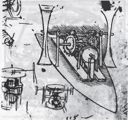 Однако первые упоминания о гребном колесе, для привода которого использовалась мускульная сила человека или животных, относятся еще к древнейшим временам. На римском барельефе, датируемом VI веком до н. э., изображено судно с тремя парами гребных колес, которые приводятся в движение волами.