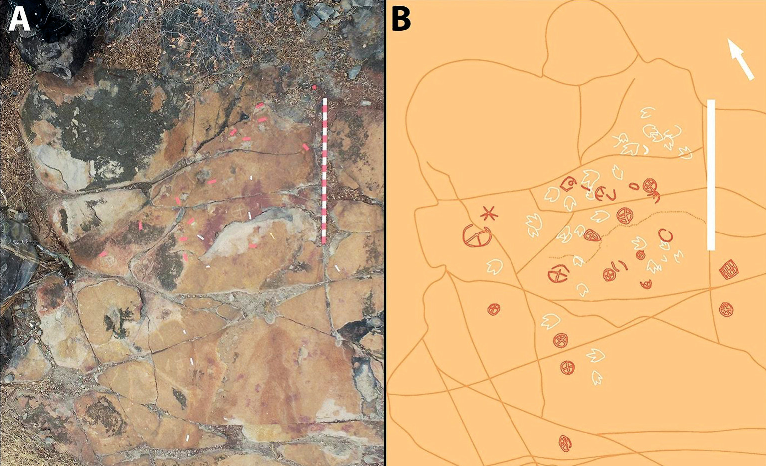 Около 140 миллионов лет назад на северо-востоке Бразилии бродили тероподы, зауроподы и игуанодонты. Это хорошо известно местным жителям, потому что в одной из долин сохранились отпечатки лап древних животных. Но долгое время мало кто обращал внимание на то, что рядом со следами динозавров есть гораздо более поздние рисунки, сделанные человеком от 9 до 3 тысяч лет назад. Теперь их подсчитали — изображений оказалось больше пятидесяти. Рисунки не очень большие — от 2,5 до 30 сантиметров — и не особенно сложные: круги с «крестами» внутри, «звёзды», кривые-«змейки» и т. д. Некоторые явно имитируют следы динозавров — нарисованы лапы с тремя пальцами; многие петроглифы расположены очень близко к «настоящим» следам. Исследователи отмечают, что подобные изображения есть в других местах Бразилии, но нигде нет такого соседства. Вероятно, древним людям оно было чем-то важно.