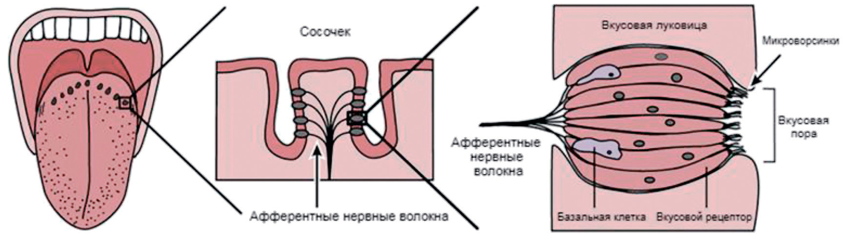 Всё начинается с языка. Он действует как «привратник», помогая различать полезные и вредные вещества. В ткани языка, мягкого нёба и глотки встроены вкусовые луковицы — скопления специализированных вкусовых клеток вытянутой формы. Они обладают многими свойствами нейронов — способностью к генерации потенциалов действия и образованию синапсов. Сама вкусовая луковица не достигает поверхности слизистой оболочки языка, в полость рта выходит только пóра, через которую вкусовая луковица и получает информацию об окружающей среде. На внешней стороне вкусовых клеток имеются микроворсинки, на которых расположены рецепторы. Ощущение горечи обусловлено наличием вкусовых G-белок-сопряжённых рецепторов (GPCR — англ. G-protein-coupled receptors) — крупных мембранных белков из семейства с крайне разнообразными функциями.