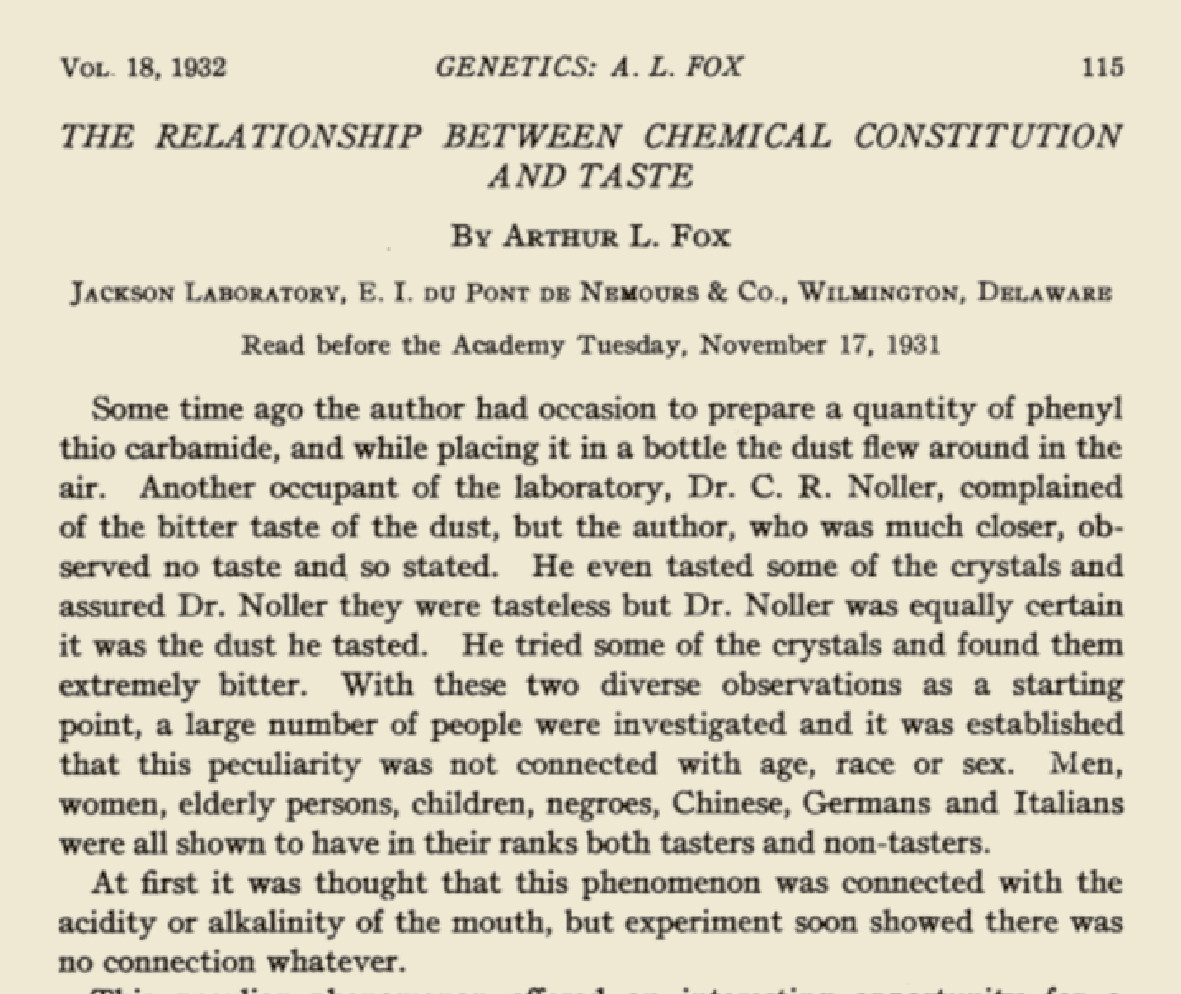 В 1932 году Фокс опубликовал в журнале «Proceedings of the National Academy of Sciences» статью, в которой описал многообразие чувствительности к фенилтиокарбамиду.