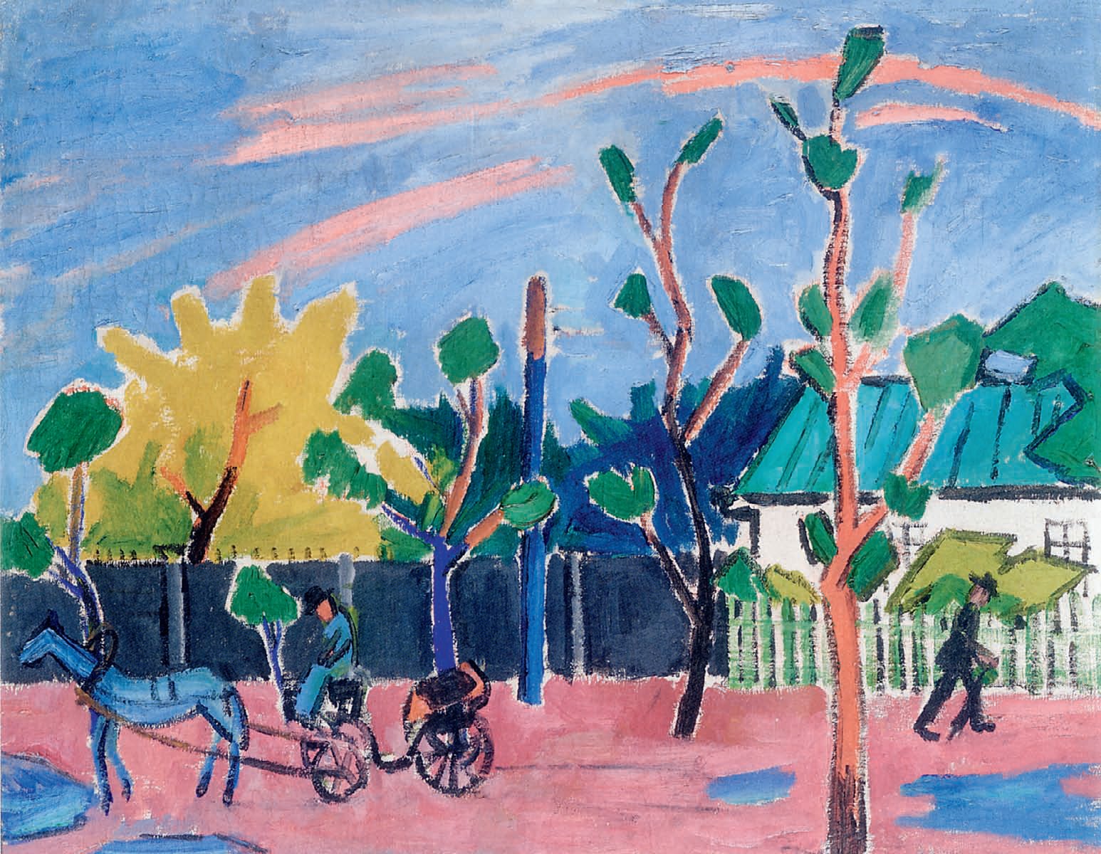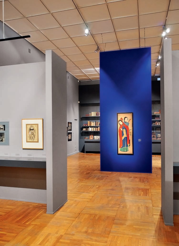 Экспозицию выставки «Михаил Ларионов» расположили в длинных залах Новой Третьяковки. Посетители движутся по некой «улице» с ярко, празднично окрашенными фасадами. Фасады словно танцуют, соединяясь под разными друг к другу углами, а то вдруг разламываются, расходятся, образуя арки и проходы, так что вы в любой момент можете оказаться на переломе и вместе с художником свернуть с намеченного пути. И выводит вас эта «улица», сменившая на каком-то этапе яркие краски на более сдержанные, к архиву мастера — точнее, к крохотной его части. И каково же ощущение? Ларионов — светлый художник, мажорный! Наследие его необыкновенно разнообразно, путь длинен, и у этого пути будто много «начал».