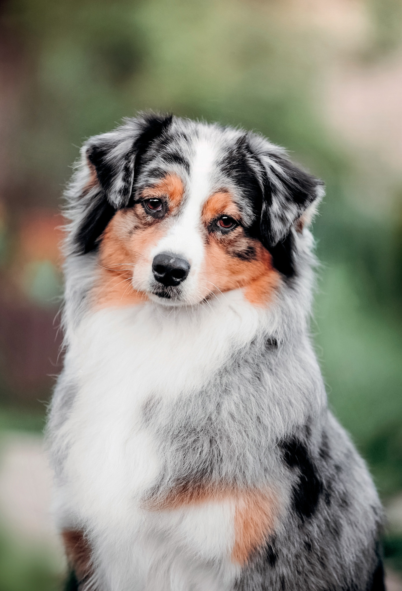 Аусси окраса мраморноголубой с белым, на щеках, бровях, груди и под хвостом рыжий подпал. Цвет глаз у собаки на фото карий, но возможен и любой другой. Фото Ксении Измайловой