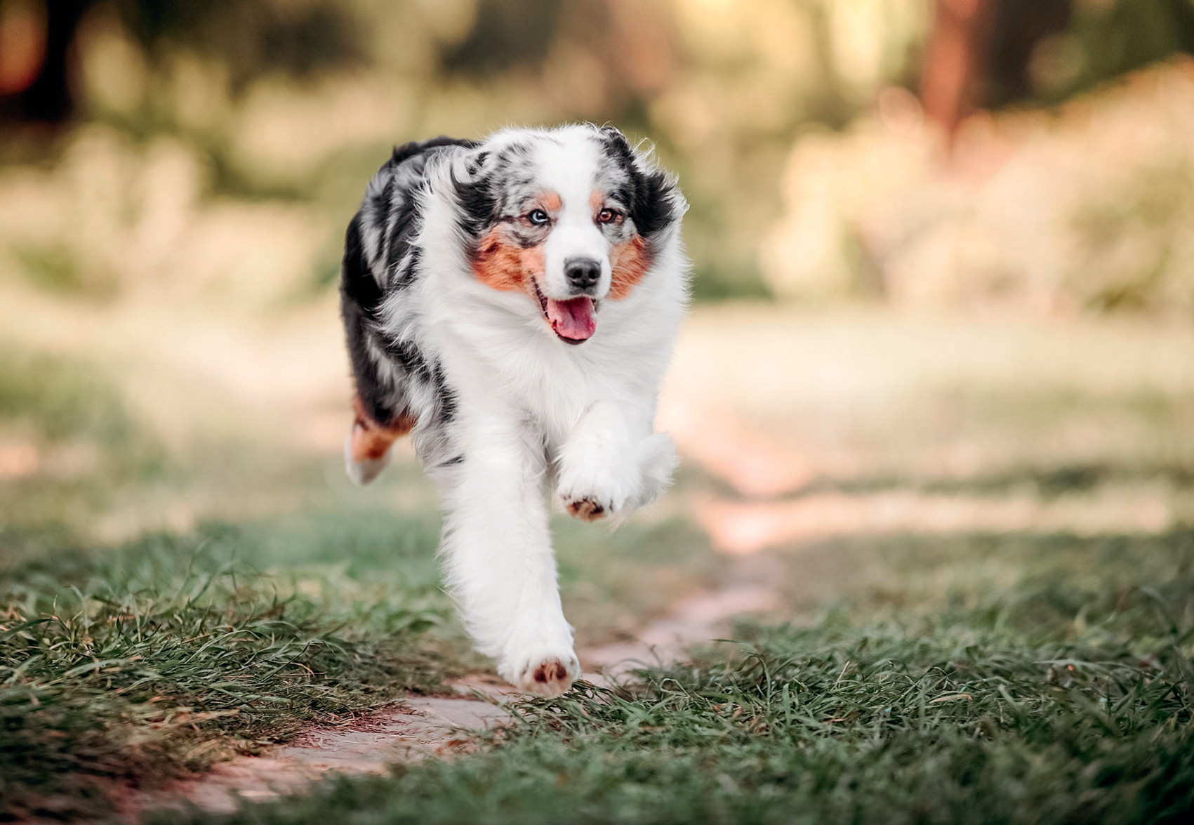 Австралийская овчарка очень активна и трудолюбива. Первоначально использовавшаяся исключительно как пастушья собака, в последние десятилетия она стала одной из самых популярных пород, её ценят как верного друга и компаньона. Выгуливать такого питомца надо ежедневно по два-три часа, чтобы он вволю набегался и наигрался. На фото аусси окраса мраморно-голубой с белым, глаза с гетерохромией, то есть разного цвета: правый — голубой, левый — карий. Фото Ксении Измайловой