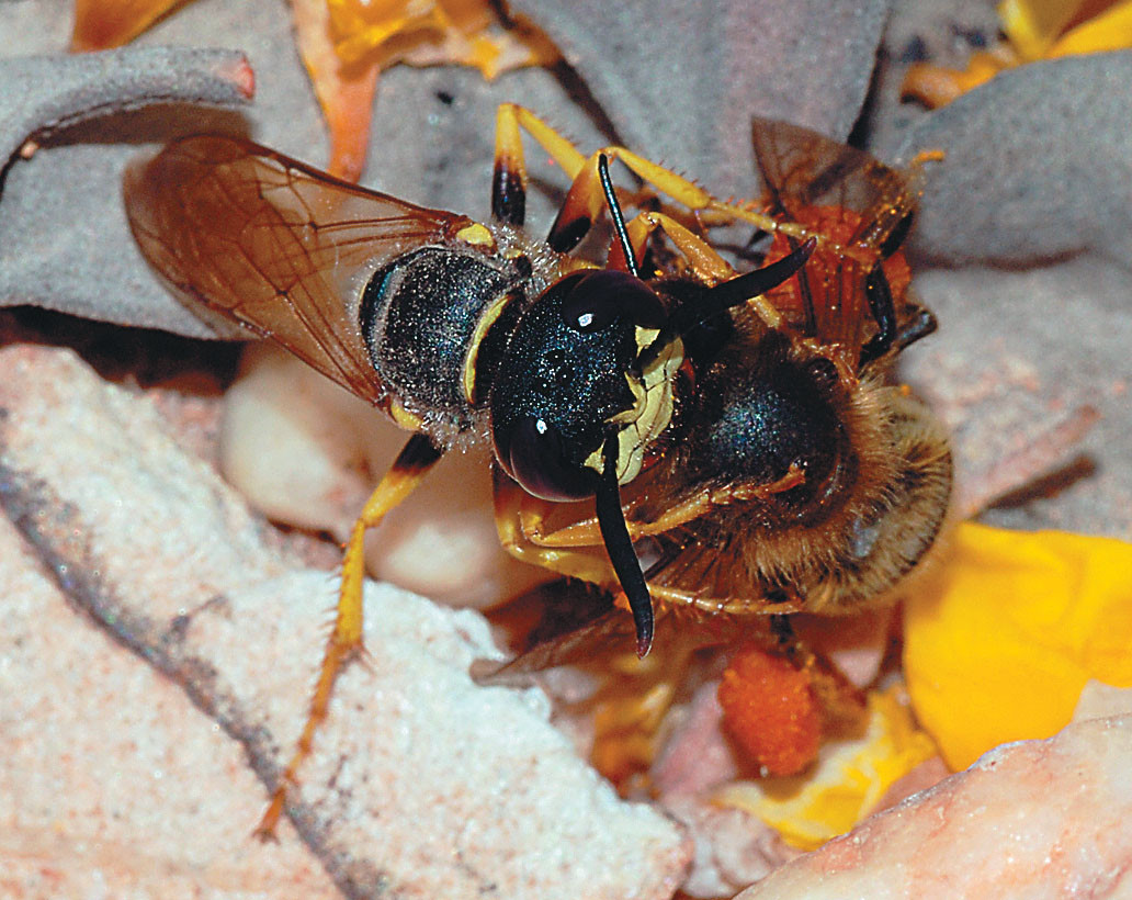 Пчелиный волк… Столь грозное прозвище оса Philanthus triangulum из семейства песочных ос заслужила благодаря своей привычке нападать и утаскивать в своё логово медоносных пчёл, увлечённых сбором нектара. Внезапная атака, удар ядовитым жалом — и вот уже оса, сжимая парализованную пчелу в объятиях, мчится к своей норке, вырытой загодя во влажной земле. Там, на метровой глубине, в темноте и прохладе среди усыплённых пчёл вскоре будет торжественно отложено яичко, из которого предстоит вылупиться голодному «пчелиному волчонку».