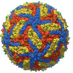 Американские вирусологи выяснили структуру вируса лихорадки Зика, открытого ещё в 1947 году и получившего имя по названию леса в Уганде, где этой лихорадкой болели обезьяны. Через несколько лет вирус стал обнаруживаться и у человека. Болезнь несмертельная, но довольно тяжёлая, а главное — даёт осложнения у беременных. Получена картина строения вируса с разрешением до 3,1 ангстрема. Оболочка вируса состоит из гликопротеинов, показанных синим, красным и жёлтым цветом, и вкраплений полисахаридов (зелёные). Исследователи наметили в этой оболочке слабые места, куда могут прикрепляться лекарства, разрушающие вирус.