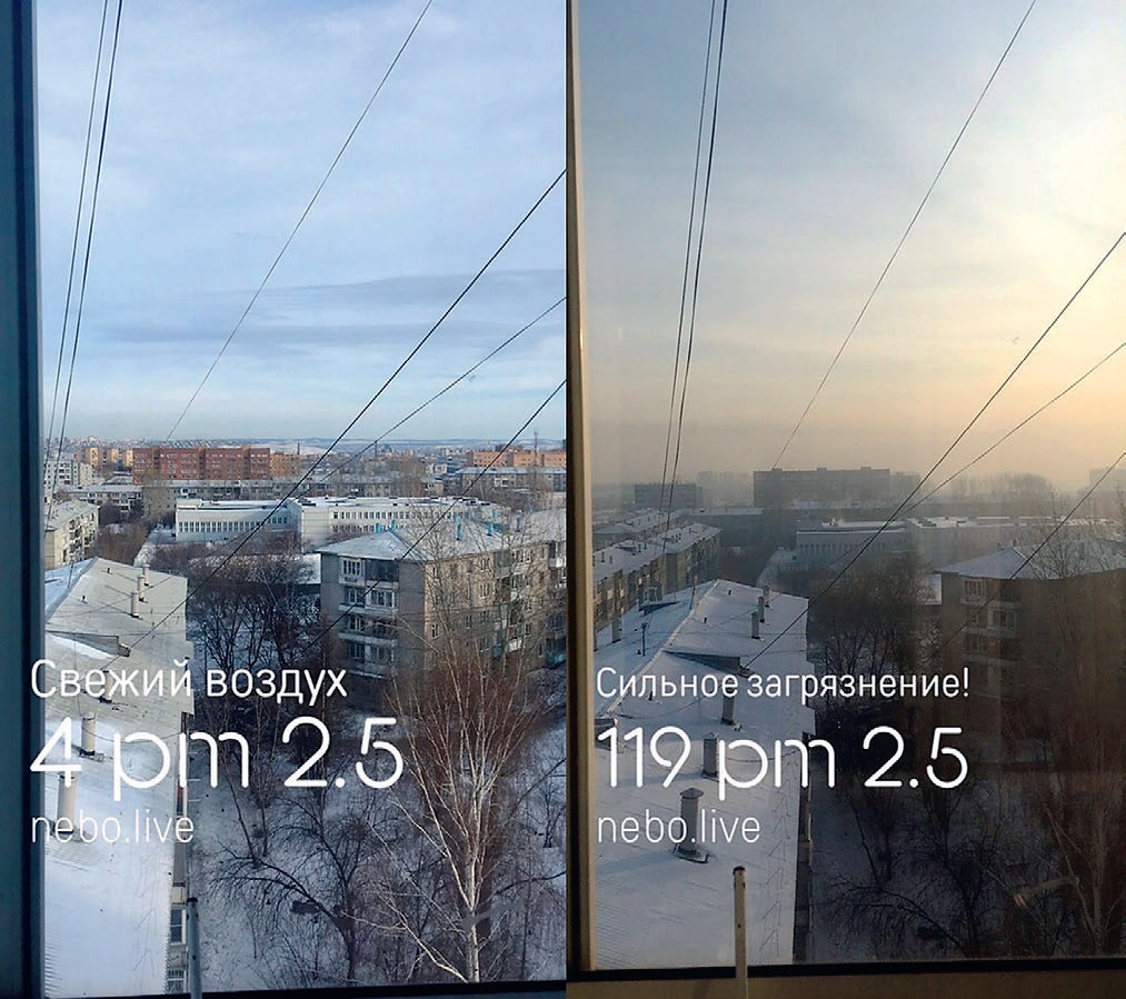 На снимках, сделанных в Красноярске, наглядно виден уровень загрязнения воздуха при 4 и 119 мельчайших частиц на 1 м3 воздуха.
