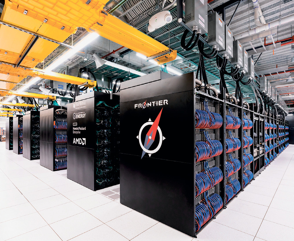 Право на этот титул должен вскоре подтвердить суперкомпьютер «Frontier», недавно запущенный в Ок-Риджской национальной лаборатории (США). Он выполняет до квинтиллиона (1018) операций в секунду. Пока заканчиваются испытания гиганта, в полную силу он начнёт работать с весны 2023 года и, возможно, даже превзойдёт заявленную скорость вычислений. Компьютер состоит из 74 шкафов (см. фото) весом по 3600 кг, суммарная потребляемая мощность около 21 мегаватта.