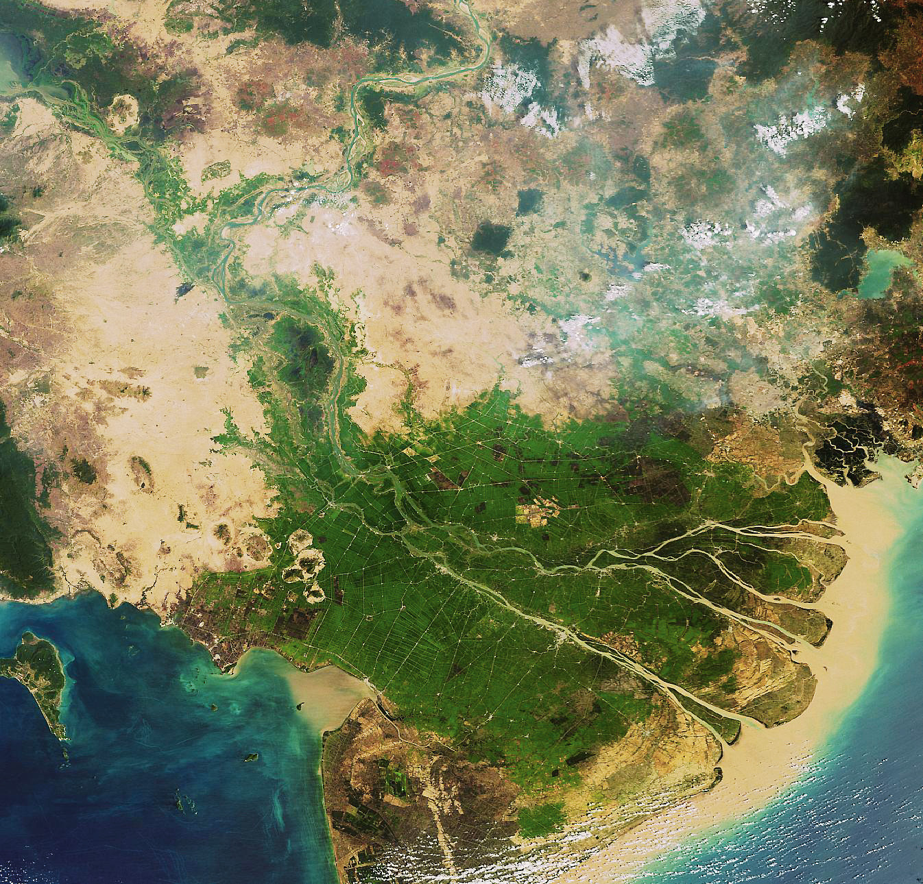 На снимке из космоса — дельта реки Меконг. Это самая большая река на полуострове Индокитай. Меконг протекает через Китай, Мьянму, Лаос, Таиланд, Камбоджу и Вьетнам, длина реки около 4500 км.