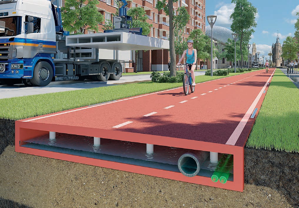 В двух голландских городах открыты экспериментальные велосипедные дорожки из пластика. Пустотелые панели размерами 3 на 2,4 м изготавливают на заводе из пластиковых бутылок из-под напитков. Внутри дорожки проходят дренажные и газовые трубы, могут быть проложены электрические кабели. Дорожка снабжена датчиками, которые позволяют круглосуточно следить за её состоянием, этот мониторинг продлится пять лет.