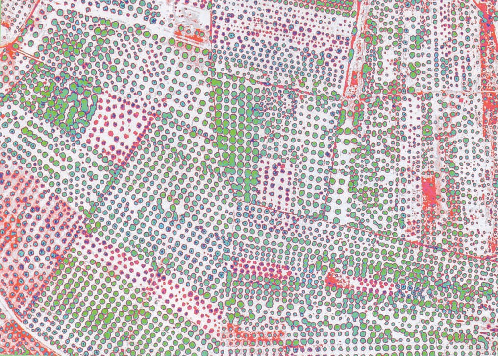 Английские специалисты по защите растений создали систему для раннего обнаружения заболевших олив по снимкам в тепловом и видимом диапазонах с воздуха, для чего используются дроны. На снимке заражённые деревья выделены красным цветом.