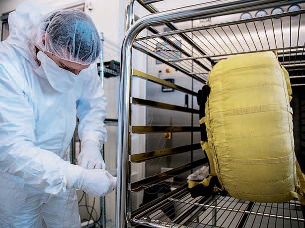 До запуска российско-европейского проекта «ЭкзоМарс-2020» осталось не так много времени. Миссия предполагает высадку на поверхность Красной планеты автоматического марсохода и посадочной платформы. Международные правила защиты планет требуют, чтобы любые аппараты, отправляемые на Марс, проходили строгую стерилизацию, во избежание занесения туда земных микробов. Сотрудники Европейского космического агентства (ЕКА) разработали тестовую модель основного парашюта миссии и провели эксперимент по его тепловой стерилизации в Лаборатории жизни и физических наук в техническом центре ЕКА в Нидерландах. Стерилизацию парашюта диаметром 35 м, сложенного в «пончик» диаметром 80 см, проводили в печи, нагретой до 125оC в течение 35 часов и 26 минут. Квалификационный парашют из нейлона и кевлара оснастили термодатчиками, что позволяет наблюдать, сколько времени требуется для достижения требуемой температуры даже в самых труднодоступных местах сложенного изделия. Эксперимент проводили в чистом помещении площадью 35 м2: весь воздух для чистого помещения проходит через двухступенчатую систему фильтров. Требования к одежде персонала чистой комнаты значительно строже, чем к одежде больничного хирурга, а возможные остатки загрязнений на одежде сдуваются воздушным душем.