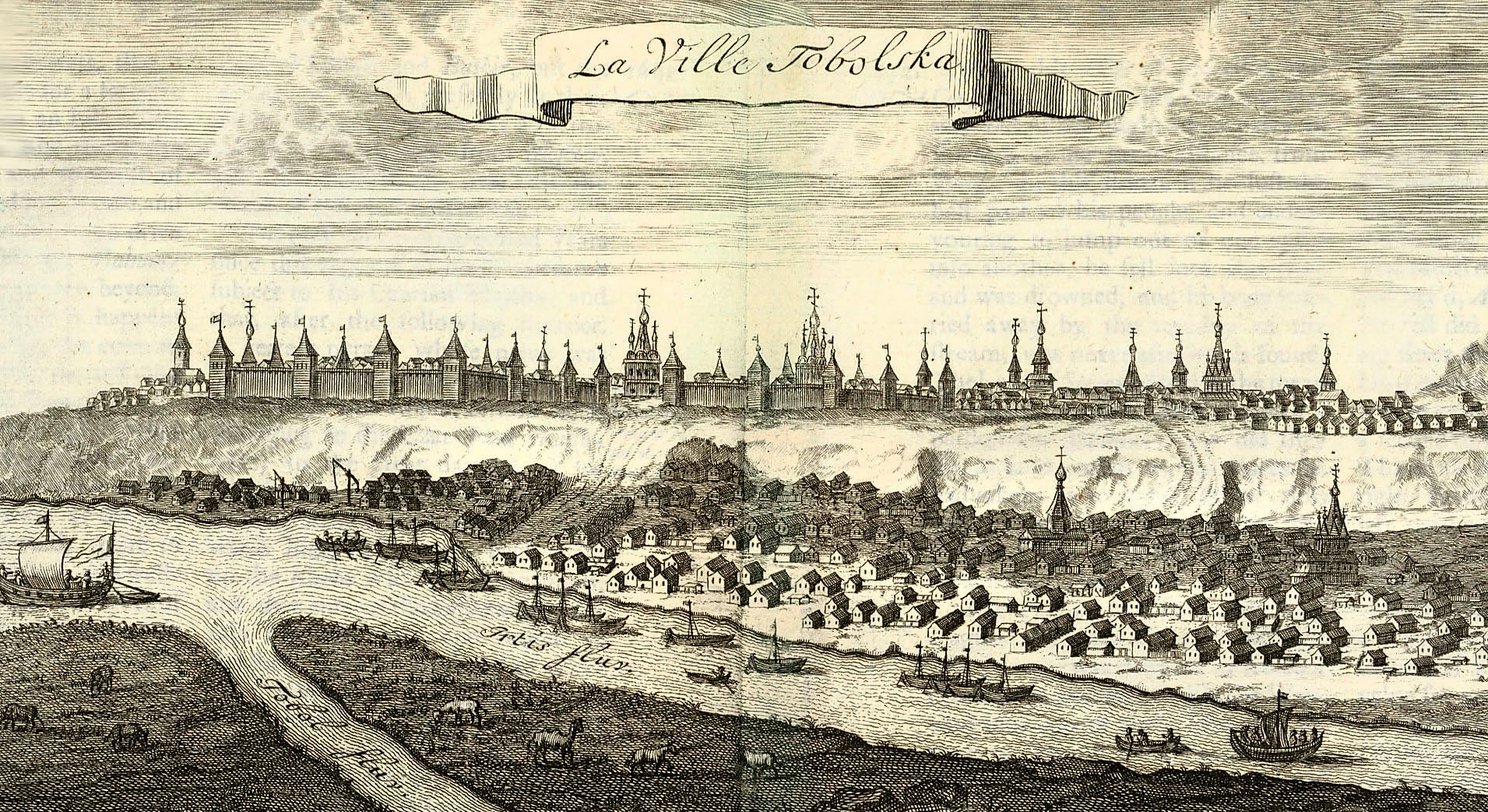 Тобольск. Гравюра из книги «Путешествия Корнелиса де Брюйна в Московию, Персию и Вест-Индию». Амстердам, 1718 год.