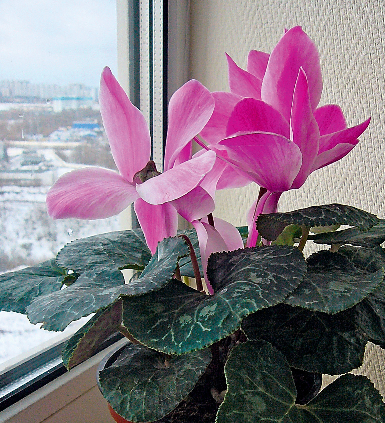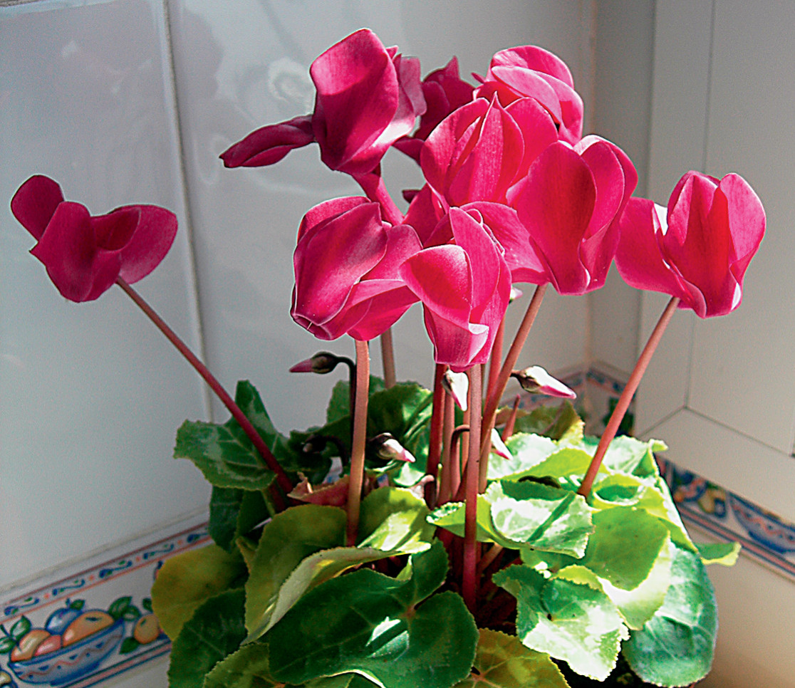 Чтобы купленный цикламен дольше цвёл, его надо держать на светлом подоконнике, но не под прямыми солнечными лучами (южное окно нежелательно). Оптимальная температура не выше 20°С. Цикламен очень чувствителен к переувлажнению и легко загнивает. Поэтому поливать надо очень осторожно — по краю горшка или в поддон, чтобы вода не попадала на точку роста, и только тогда, когда поверхность почвы высохнет.