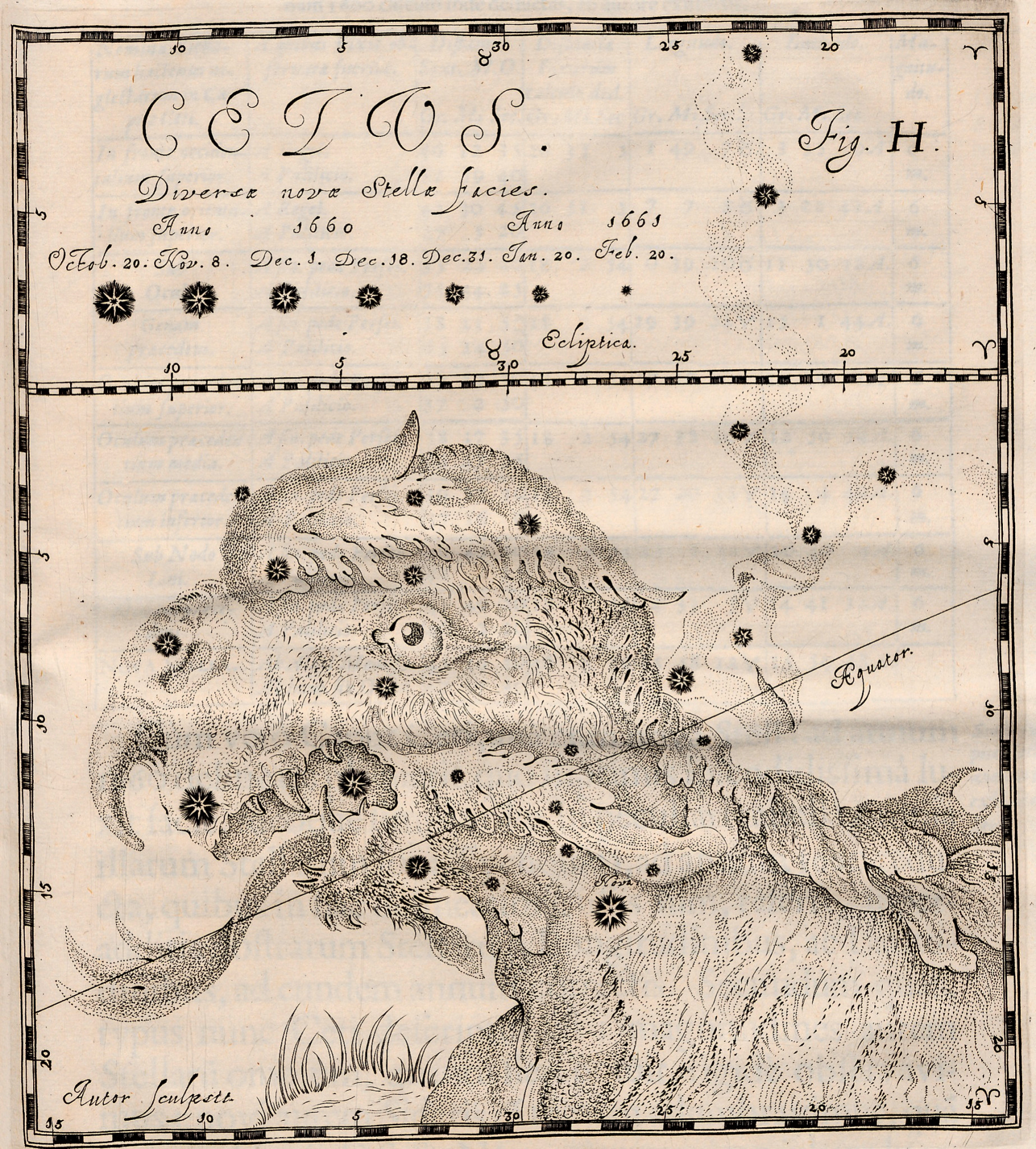 Астроном Ян Гевелий из Данцига, автор каталога из 1564 звёзд и знаменитого атласа созвездий «Уранография», настолько заинтересовался необычной звездой, что наблюдал за ней более 20 лет — с 1659 по 1682 год. Именно благодаря его трактату «Historiola Mirae Stellae» («История чудесной звезды») 1662 года звезда получила современное название «Мира», хотя в самой книге на изображении созвездия она всё ещё подписана «Nova».