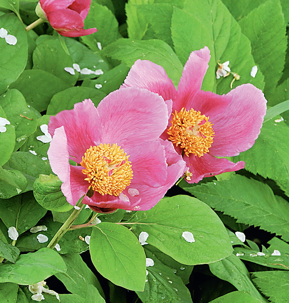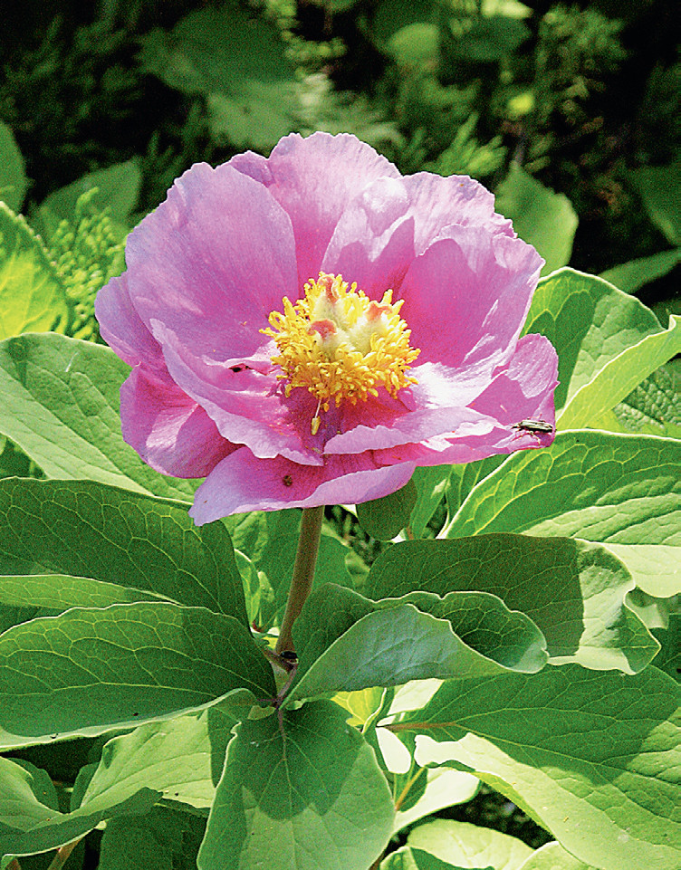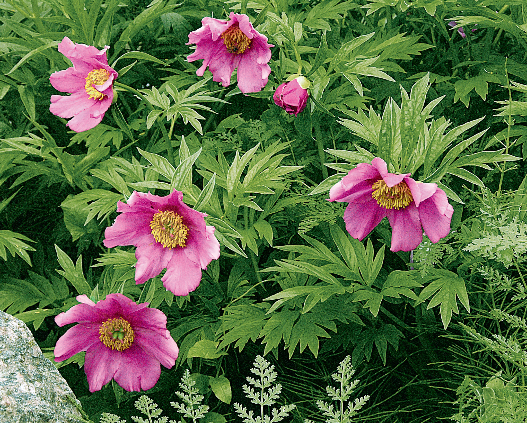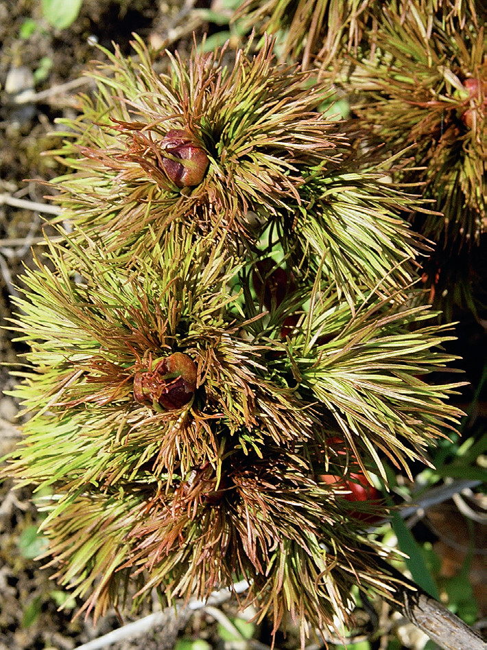 Мы тоже знаем пион лекарственный как обитателя «бабушкиных» цветников. Он внёс большой генетический вклад в дальнейшую селекцию сортов. Его хорошо узнаваемое наследие — толстые веретеновидные (то есть суженные в основании и на конце) корни со спящими почками. Благодаря таким корневым почкам куртина лекарственного пиона довольно быстро расползается по участку. «Излюбленная» окраска растений этого рода — розовая, огненно-красная тоже бывает, но встречается реже. И самыми яркими красными цветками отличаются пион иноземный (P. peregrina), населяющий светлые леса от южной Италии до Турции, а также отечественный степной пион тонколистный, или пион воронец (P. tenuifolia). Оба вида, так же как и пион лекарственный, имеют веретеновидные корни, но без почек.