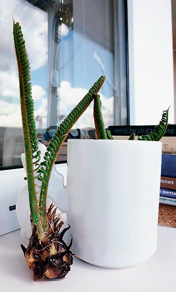 Пошли в рост и первые листья! Но у одного из трёх, самого маленького, лист не раскрылся, у второго — замер и начал засыхать по краям. Лишь один саговник я посадила в почву, он был самый крепкий, и мне казалось, что уж ему-то хватит сил на долгую жизнь... Я любовалась им! Расширенное основание выглядело как луковица с толстыми, мясистыми, заострёнными на верхушках чешуями. Листочков оказалась пара — перистые, плотные. На первых порах развития они свёрнуты в виде улиток, затем постепенно раскручиваются. Так, из трёх саговников у меня укоренился и пошёл в рост только один. Но я считала, что эксперимент удался.