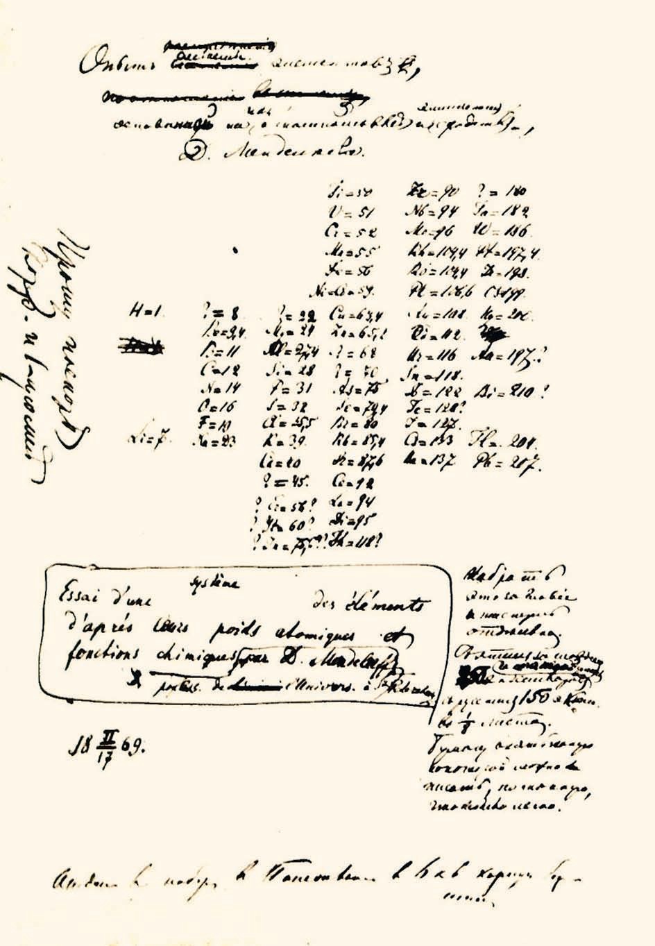 История не даёт однозначного ответа на ряд вопросов, связанных с окончанием работы над первой версией Периодической таблицы. Известно, что в понедельник, 17 февраля 1869 года, Менделеев завершил разработку рукописной версии таблицы «Опыт системы элементов, основанной на их атомном весе и химическом сходстве». Необходимая дополнительная информация содержалась в статье, которая была написана в последней декаде февраля и опубликована также в 1869 году в «Журнале Русского химического общества».