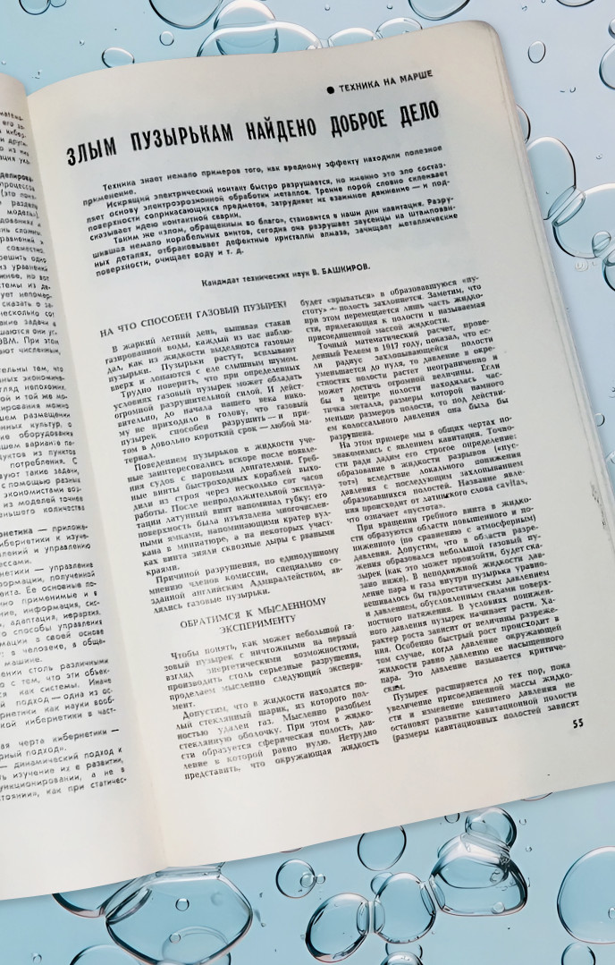 В 1973 году в журнале «Наука и жизнь» была опубликована статья* с забавным названием «Злым пузырькам найдено доброе дело», посвящённая нескольким полезным применениям кавитации, которая долгое время считалась явлением сугубо вредным. Как теперь стало ясно, тогда только лишь начинались широкомасштабные исследования использования этого явления в различных сферах деятельности. За прошедшее время кавитация обосновалась в пищевой, фармацевтической и топливной промышленности, машиностроении, материаловедении, химии, медицине, косметологии, а также занялась очисткой и обеззараживанием. И интерес к ней не спадает. Настало время разобраться, что же произошло за эти пятьдесят с лишним лет.