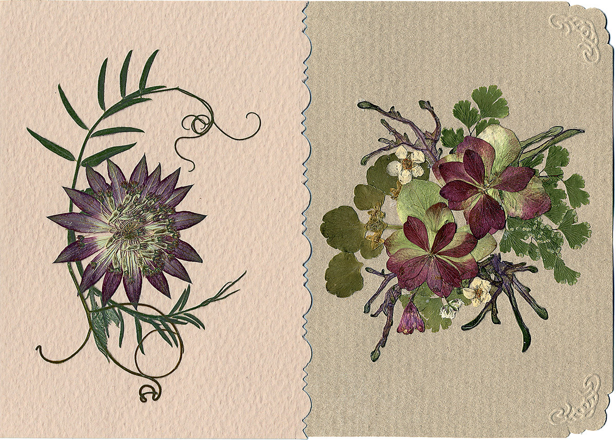 Много лет назад, будучи в Вильнюсе, я попала в цветочный магазин. На прилавке лежали открытки, каких я раньше не видела. Простой листок бумаги был сложен вдвое, а сверху приклеены прессованные цветы. Незатейливая композиция из лепестков, листочков и стебельков привела меня в восторг: «из ничего» рождалось произведение искусства! И вот уже 20 лет я занимаюсь моим любимым рукоделием. В последние годы подобным творчеством увлекаются многие. У каждого свой вкус и свои предпочтения. (См. «Наука и жизнь» № 3, 2020 г., стр. 92, статья «Не забывай меня» и № 8, 2022 г., стр. 88, статья «Цветы и мода». — Прим. ред.) Я предлагаю познакомиться с моими работами и, если они придутся вам по душе, освоить это занятие. Тем более, что сейчас самое подходящее время делать заготовки.