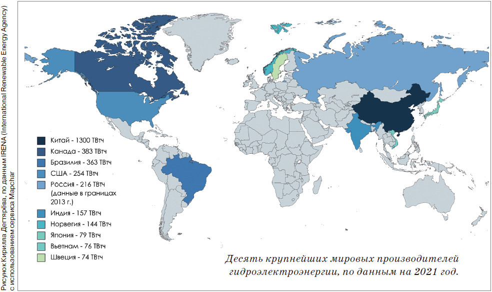 Мировое производство электроэнергии на солнечных электростанциях с 2013 по 2022 год выросло почти в десять раз — со 140 до 1300 ТВт·ч/год, на ветровых электростанциях — более чем в три раза, с 650 до 2100 ТВт·ч/год, а годовое производство электроэнергии на гидростанциях за это время увеличилось всего на 13% (то есть росло лишь на 1% с небольшим в год) — с 3800 до 4300 ТВт·ч1. Речь в данном случае только о гидроэлектростанциях (ГЭС) на реках, тогда как доля станций, использующих энергию приливных (ПЭС) и ветровых волн, остаётся исчезающе малой — за последние десять лет список ПЭС пополнился всего несколькими станциями небольшой, до нескольких мегаватт, мощности у берегов Великобритании и Канады. Как следствие, вклад всех возобновляемых источников энергии (ВИЭ) в мировое производство электроэнергии за прошедшее десятилетие вырос с 20 до 30%, при том что доля ГЭС даже несколько снизилась — с 18% до 16%2.