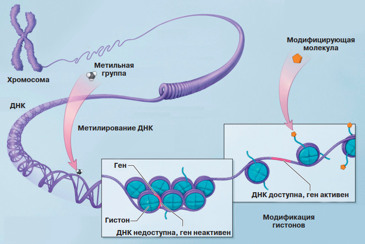 Другой вариант эпигенетической регуляции — это плотная упаковка ДНК. Клеточная ДНК всегда пребывает в комплексе с разными белками, образуя так называемый хроматин. Главные белки хроматина — гистоны: они физически поддерживают нити хромосомной ДНК, не давая им перепутаться и защищая от повреждений. Гистоны отвечают за упаковку ДНК, благодаря им длиннейшие хромосомы помещаются в крохотном ядре (общая длина ДНК всех человеческих хромосом около 2 метров, диаметр клеточного ядра — около 10 микрометров). При этом упаковка может быть более плотной и менее плотной. Когда клетка делится, её хромосомы упакованы полностью и упакованы очень плотно, чтобы их легко было распределить между дочерними клетками. Но и между делениями часть ДНК остаётся в плотной упаковке — и это значит, что с такой ДНК никакую информацию скопировать нельзя. Поведение гистонов опять же зависит от химических модификаций: к аминокислотам в гистоне присоединяются метильные группы, или ацетильные, или остатки фосфорной кислоты, или какие-нибудь ещё. В зависимости от того, какие именно аминокислоты и как именно были модифицированы, гистоны на определённом участке ДНК либо упакуют его плотно, либо освободят его для других белков, которые смогут с ним работать.