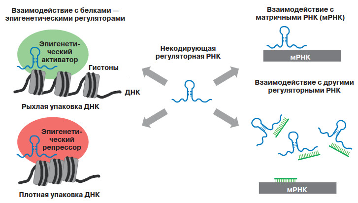 Кроме того, регуляторные РНК могут взаимодействовать друг с другом, что опять же будет сказываться на состоянии подведомственных им матричных РНК. Наконец, эпигенетические эффекты от регуляторных РНК могут быть связаны с тем, что они начинают сотрудничать с другими эпигенетическими игроками — например, с белками, участвующими в модифицировании гистонов.