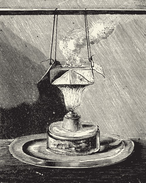 Вот еще несколько интересных опытов. Возьмите обыкновенный чугунный утюг и поставьте его так, чтобы гладкая поверхность его была кверху. Натяните на утюг тонкую и редкую бумажную, или шелковую ткань, напр. тонкий платок. Затем возьмите несколько небольших пылающих углей, положите сверху на платок и продолжайте сильно раздувать угли. Если через несколько секунд и даже минут быстро сбросить угли, то платок окажется совершенно целым; между тем раскаленные угли непременно прожгут дыру в течение одной, двух секунд в том же самом платке, если он положен, напр., на стол. Дело в том, что чугун быстро поглощает тепло. Для успешности опыта необходимо, чтобы поверхность утюга была очень гладкая, а также, чтобы платок был тонок и плотно прилегал к утюгу. Вместо утюга, можно взять кусок другого полированного металла.