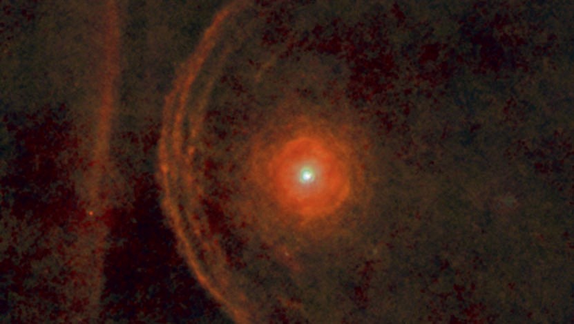 Что же могло так сильно раскрутить звезду? В 2016 году группа американских астрономов предположила, что раньше Бетельгейзе была двойной звездой с компаньоном значительно меньшей массы. Когда Бетельгейзе раздулась и превратилась в красного сверхгиганта, она поглотила его. В результате произошёл взрыв, выбросивший в космос значительную часть вещества компаньона и сообщивший Бетельгейзе дополнительную скорость вращения. Надо отметить, что в окрестностях сверхгиганта в 2012 году действительно обнаружена охватывающая его дуга вещества неизвестного происхождения. Астрофизики ранее полагали, что это ударная волна, создаваемая в межзвёздной среде быстро движущейся звездой, однако, как оказалось, существует и другое объяснение её происхождения.