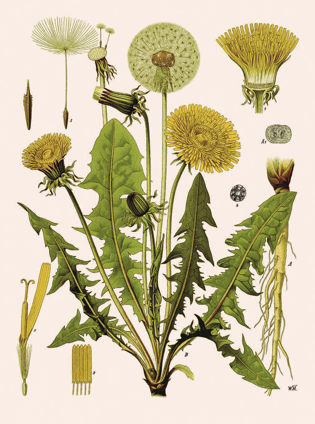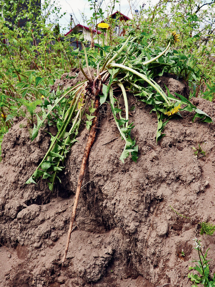 Одуванчик лекарственный (Taraxacum officinale) относится к обширному семейству Сложноцветные (Asteraceae). В земле он прочно закреплён толстым, стержневым корнем, достигающим метра в длину. Как правило, в почву главный корень уходит вертикально вниз, формируя тонкие боковые корешки, и только на каменистых грунтах изгибается и даже разветвляется.