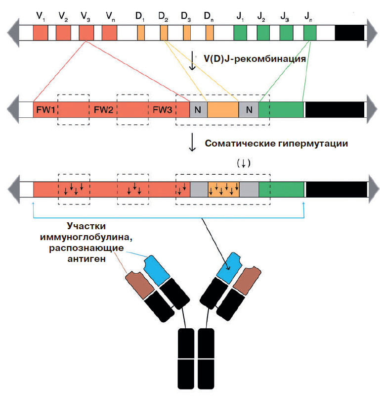И рецепторы В-клеток (BCR, B-cell receptors), и рецепторы Т-клеток (TCR, T-cell receptors), и антитела относятся к большому суперсемейству белков иммуноглобулинов. Как и у всех белков, информация о них записана в ДНК, однако записана она особым образом. В иммуноглобулине есть кусок, которым он связывается с антигенами. Этот кусок состоит из нескольких блоков. Некоторые из них записаны в ДНК сразу во многих вариантах. Для наглядности здесь можно представить книгу, в которой одна и та же глава повторяется сорок четыре раза, причём текст на каждой из копий страниц будет в какой-то мере отличаться от других. (Число «сорок четыре» взято не просто так — именно столько повторяющихся, но отличающихся вариантов есть в одном из иммуноглобулиновых сегментов в геноме человека.) Таких глав в иммуноглобулиновой «книге» несколько.