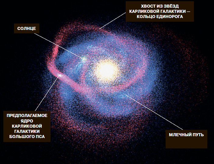 Постепенно Млечный Путь вытягивал её звёзды, межгалактический газ и пыль и делал частью себя. Именно благодаря этому «завтраку» в нашей Галактике зажглись новые источники света. Форма «Карлика» исказилась, а по его орбите растянулся длинный шлейф из звёзд, который теперь стал сложной кольцеобразной структурой, оборачивающейся вокруг Млечного Пути в три кольца вдоль орбиты своего вращения. Этот след называют ещё Кольцом Единорога по наименованию того созвездия, в направлении которого и были найдены светила Карликовой галактики Большого Пса.