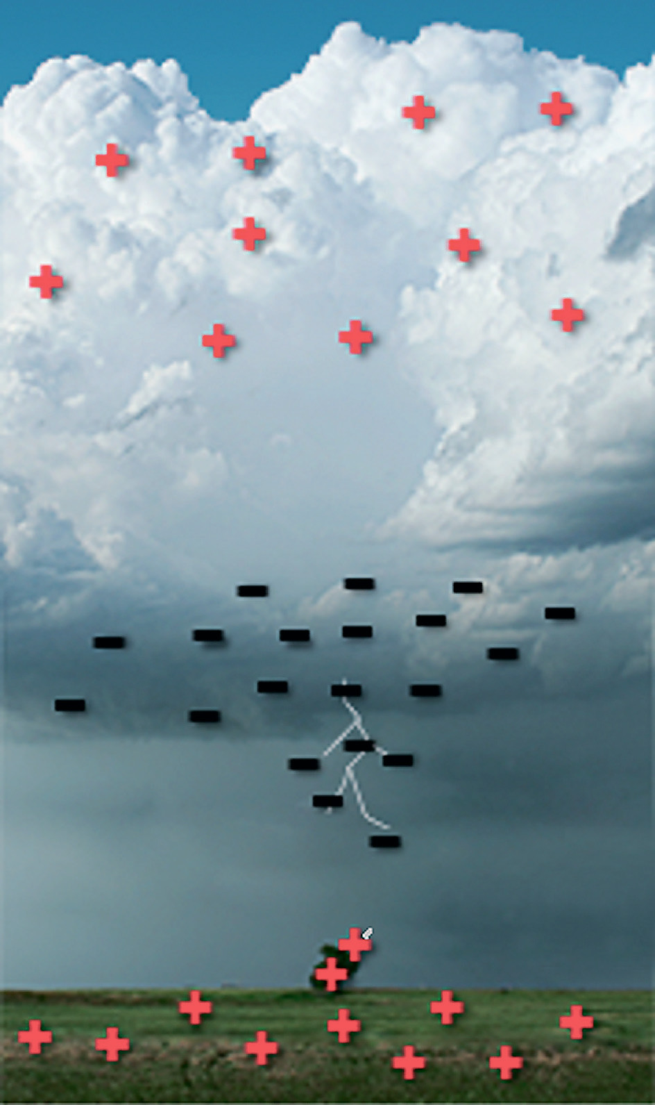 Распределение зарядов в грозовом облаке и формирование отрицательного канала — ступенчатого лидера в направлении земли. Навстречу ему тянется стример положительного заряда. Изображение: NOAA (с изменениями)